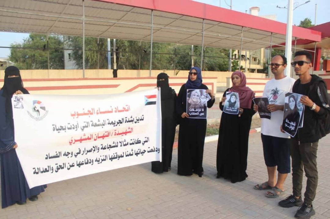 وقفة احتجاجية في عدن تطالب بالعدالة لإفتهان المشهري ومحاسبة الجناة